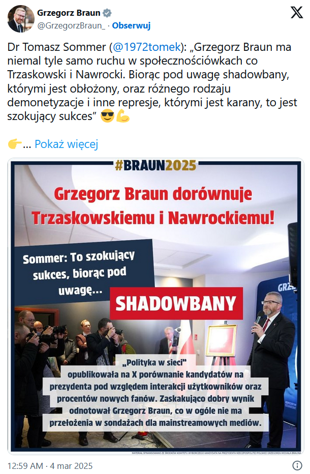 Zarejestrowany ! Sukces w Internecie ! Posted on 2025-03-112025-03-11 By admin Brak komentarzy do Zarejestrowany ! Sukces w Internecie ! Nareszcie, po 10 dniach od złożenia dokumentów i podpisów, Grzegorz Braun został zarejestrowany jak kandydat na Prezydenta Polski. Gratulacje, Panie Grzegorzu! Bez kategorii